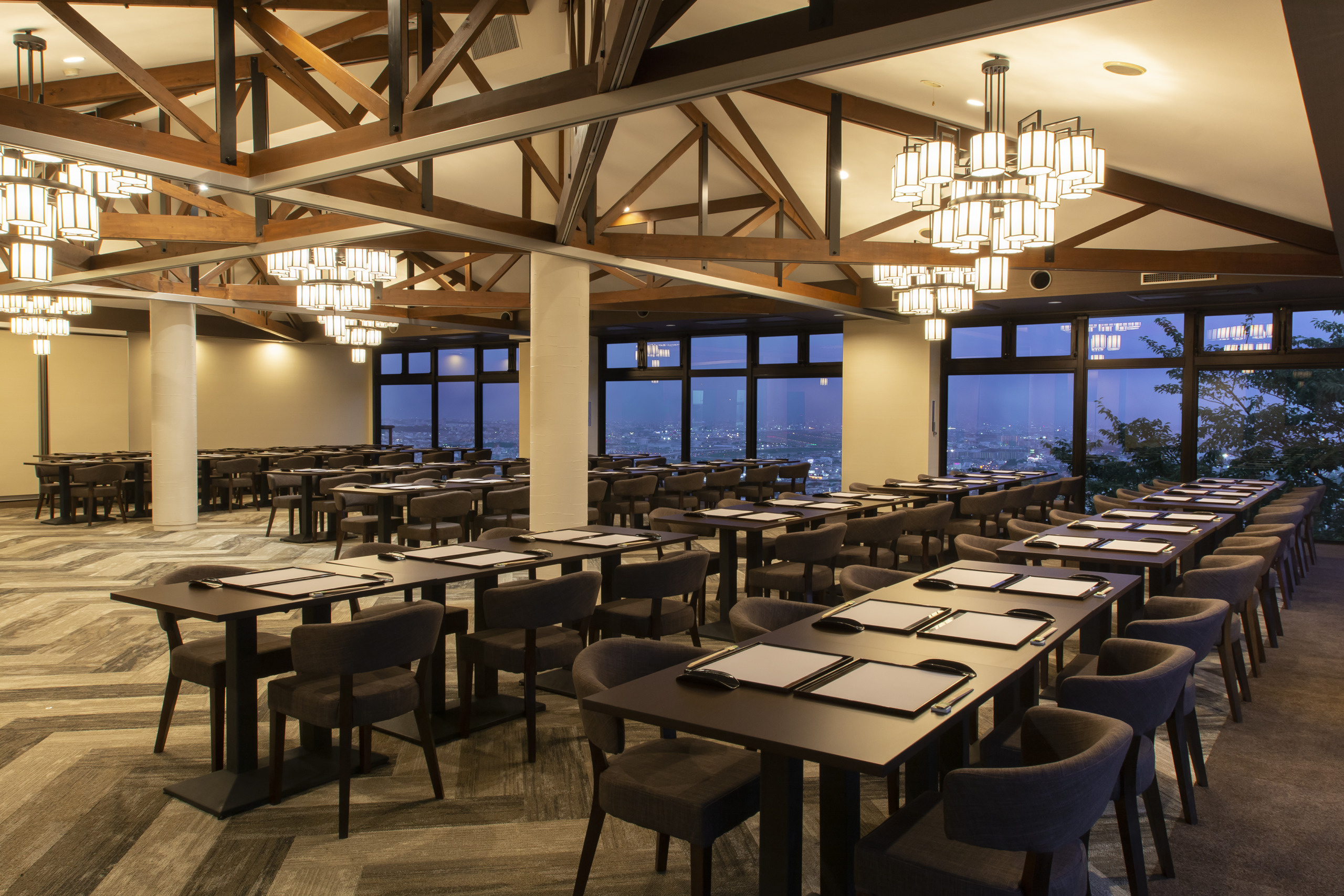 緑豊かな高台にあり、店内からは大阪平野のパノラマが広がりさらには六甲山系、大阪湾、和歌山、生駒山系まで一望できる絶好のロケーション。夜はさらにロマンチック。