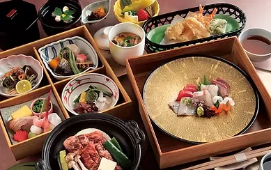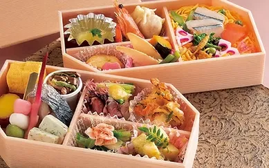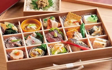 仕切りのそれぞれに刺身、焼き物、煮物、飯などを見栄え良く配置する。昭和の初めごろから始まったとされる和食でおもてなし料理を振舞う際に使われるお弁当形式の盛付。