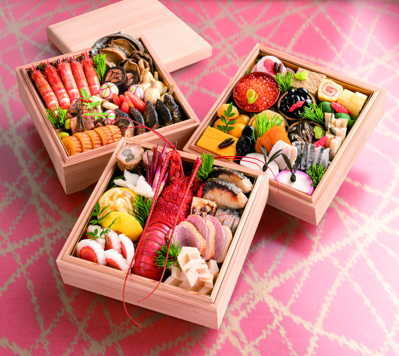 伊勢海老、銀鱈味噌漬、柚子釜盛烏賊真砂和え、矢羽根蓮根、初神、鴨肉燻製、菊花日の出蕪、鶴大根、亀人参、鰤粕漬、若鶏八幡巻